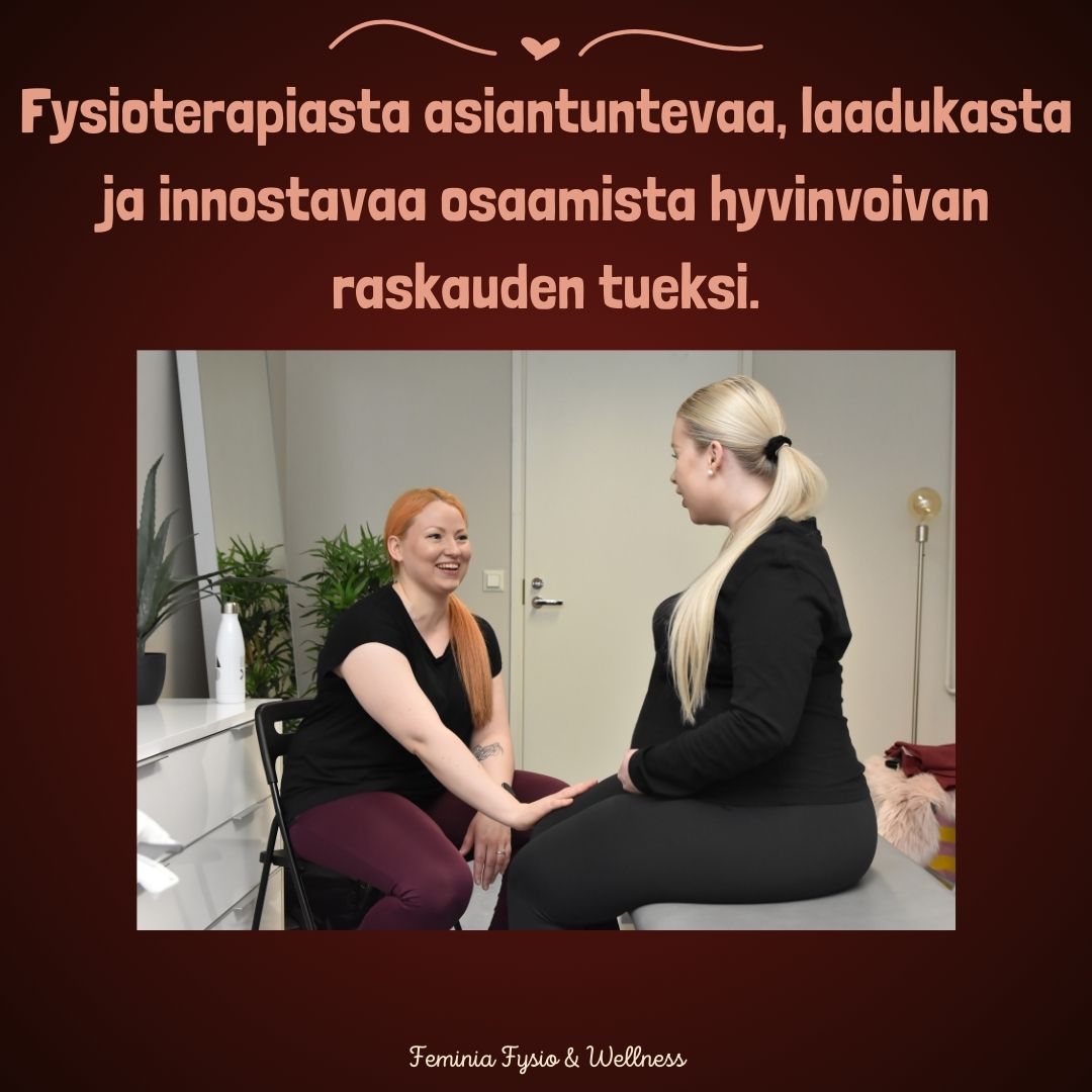 Feminian raskaana oleville äideille suunnattu fysioterapia on kokonaisvaltaista ennaltaehkäisevää, ylläpitävää tai kuntouttavaa fysioterapiaa. Raskausajan fysioterapiaan on tervetulleita kaikki raskaana olevat äidit missä tahansa vaiheessa raskautta positiivisen raskaustestin jälkeen!